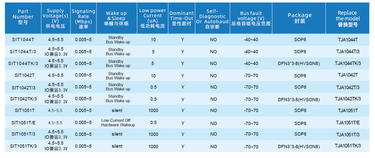 总线耐压能力-40V~40V; HBM防护8KV; 支持5Mbps(CAN FD)(灵活数据速率); 性能达到或优于“ISO 11898”标准,提供SOP8以及DFN3*3-8,小外形,无引脚封装; 驱动器(TXD)显性超时功能,待机总线(BUS)显性超时功能,带唤醒功能的低功耗待机模式,内置过温保护功能; SIT1044T/3型号I/O电压范围支持3.3V和5V MCU; VCC和VIO电源引脚上具有欠压保护; 通过-40℃~125℃高低温老化实验,满足工控与车载应用范围; 高抗电磁干扰能力,未上电节点不干扰总线