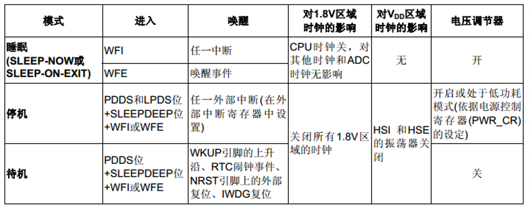注:在进入停机或待机模式时,RTC、IWDG 及其相应的时钟不会被停止。