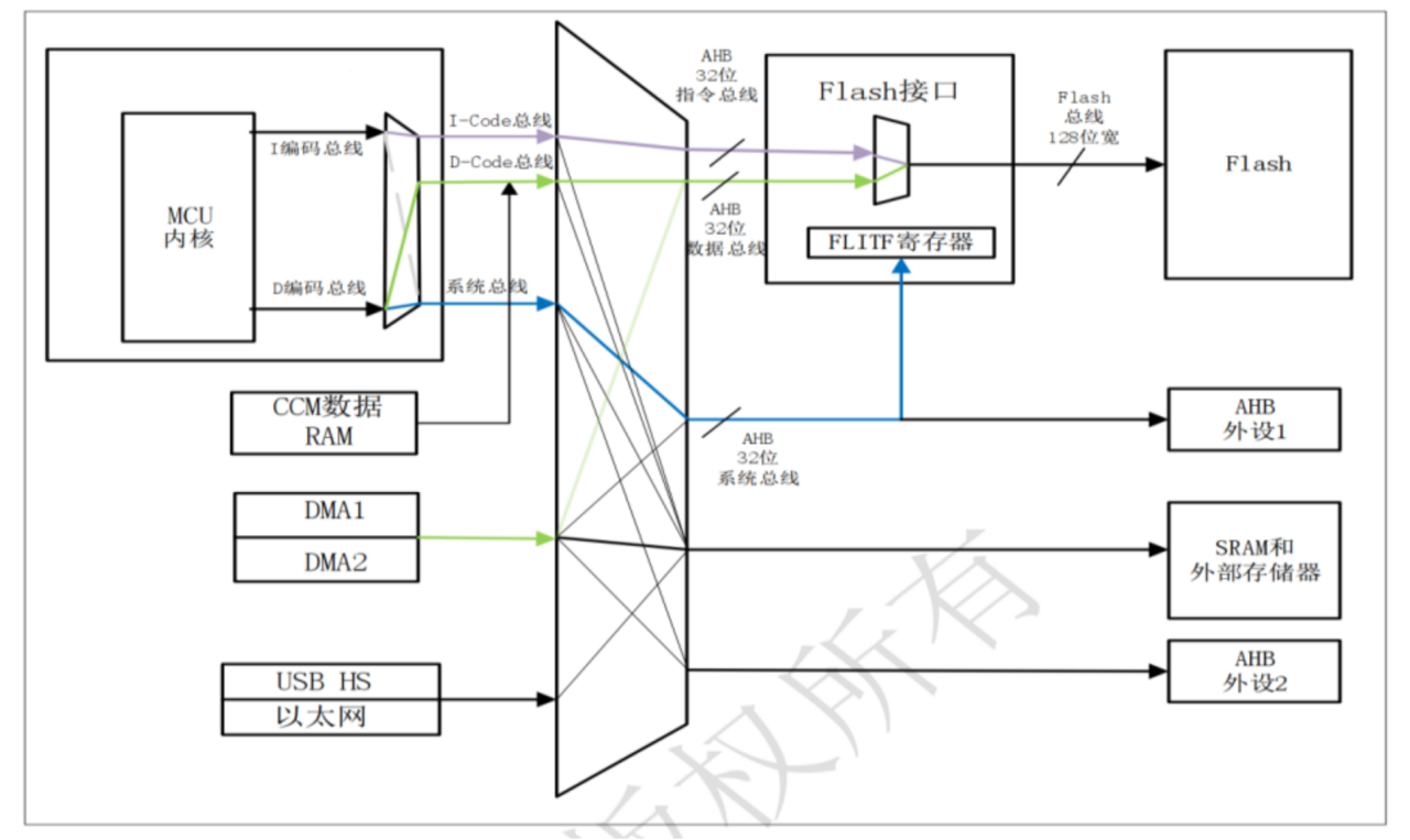 FLASH结合了ROM和RAM的优点,不仅具备了EEPROM的可擦写性能,还类似于失性随机存储器(NVRAM),不会因断电而丢失数据,且能以较快的速度读取数据。对于CKS32F4xx系列的FLASH接口,它负责管理CPU通过AHB I-Code和D-Code总线对FLASH进行访问,这个接口可以执行擦除和编程操作,同时实施了一些读写保护机制,以确保数据的安全性。此外,FLASH接口还通过指令预取和缓存机制来提高代码执行的速度。下图为系统架构内的FLASH接口连接图: