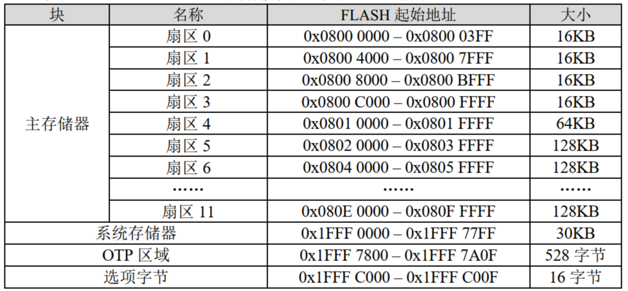 ①主存储器:该部分用来存放代码和数据常数,分为12个大小不同的扇区,主存储器的起始地址是0x08000000;