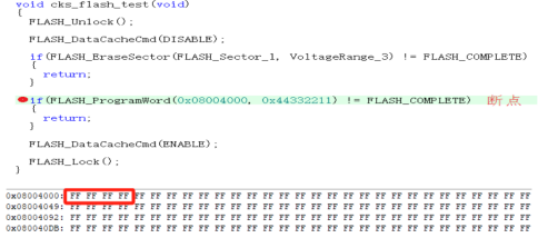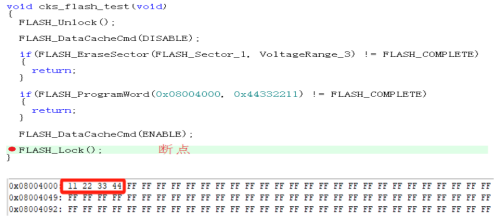 主函数对cks_flash_test函数调用,cks_flash_test函数实现对指定地址0x08004000进行擦除,写入操作。通过断点调试,如图1当程序运行至FLASH_EraseSector后,0x08004000起始处的四个字节先被擦除成0xFF;如图2,当程序运行运行至FLASH_ProgramWord之后,执行向0x08004000写入0x44332211后,0x08004000起始处数据变成0x11、0x22、0x33、0x44。