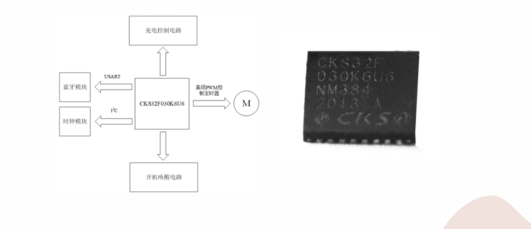 基于 CKS32F030K6U6 设计的智能电动牙刷,其功耗低,功能丰富。该智能电动牙刷内嵌时钟模块和蓝牙模块,可将刷牙数据通过蓝牙模块传送至 APP,方便用户掌握自己的刷牙情况。