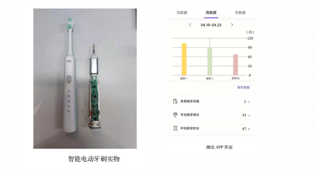 智能电动牙刷的实物图。振动频率高达 31920 次/min。智能电动牙刷关机前会上报刷牙数据,配有测试 APP 进行测试,测试 APP 界面如图 所示。主界面显示刷牙数据如刷牙时间、刷牙天数等,可让用户了解自身的刷牙情况。