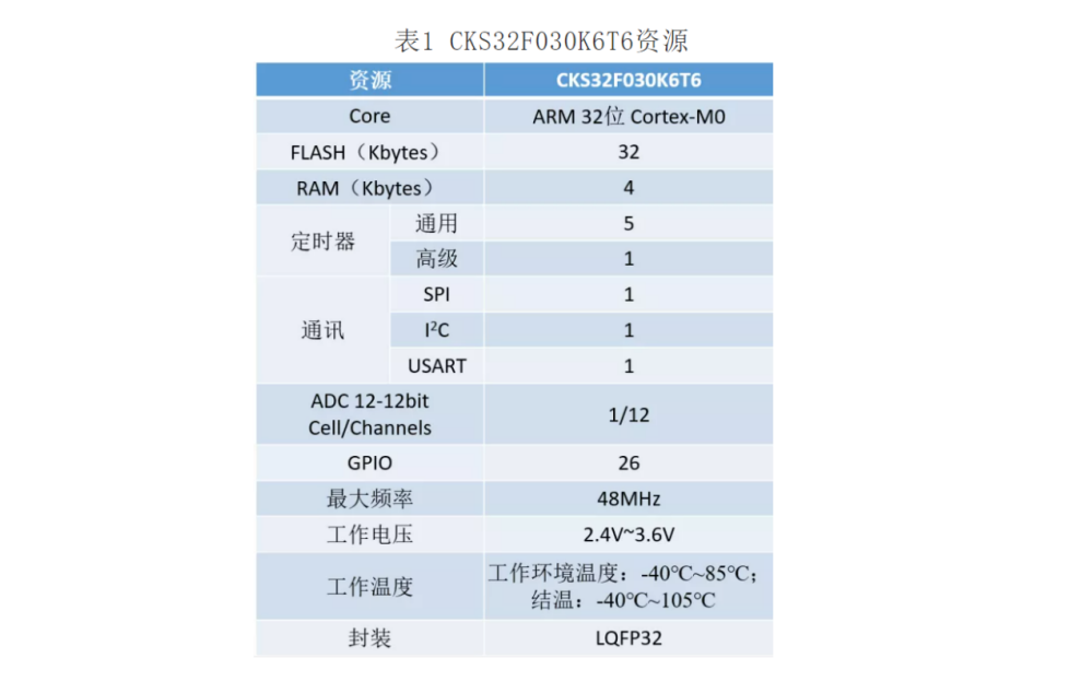 中科芯CKS32F030K6T6采用高性能的ARM®CortexTM-M0 32位RISC内核,最高工作频率为48MHz,高速嵌入式内存(FLASH最高可达32K字节,RAM可达4K字节),并广泛集成增强型外设和I/O口。提供标准的通信接口(I2C、SPI、USART各一个),1个12位ADC,5个16位定时器。
