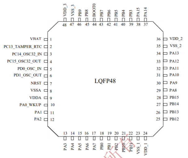 无人机主要由机载飞控系统和地面测控系统两部分。其中飞控系统以CKS32F103CBT6微控制器(MCU)为核心,芯片引脚图如图1所示。模块包括数据采集系统、GPS模块、遥控解码模块、舵机驱动模块、数传电台模块、电源模块等。地面测控系统包括测控计算机、数传电台模块、地面站软件、发射机。稳定可靠的硬件系统是飞控系统研制成功与否的关键。