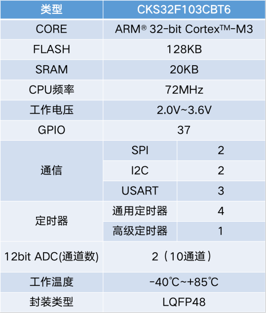 中科芯CKS32F103CBT6采用高性能的ARM®CortexTM-M3 32位RISC内核,最高工作频率为72MHz,内置高速存储器(FLASH最高可达128K字节,SRAM可达20K字节),丰富的增强I/O端口和联接到两条APB总线的外设。其中包含2个12位ADC、3个通用16位定时器和1个PWM定时器,此外,还包含标准和先进的通信接口:多达2个I2C和SPI接口、3个USART接口、1个USB接口和1个CAN接口。产品供电电压为2.0V至3.6V,-40℃至+85℃的扩展温度范围,一系列的省电模式保证低功耗应用的要求。这些丰富的额外设配置,使得CKS32F103CBT6微控制器可使用于多种应用场合,如电机驱动和应用控制、医疗和手持设备、PC游戏外设和GPS平台、工业应用等 |
