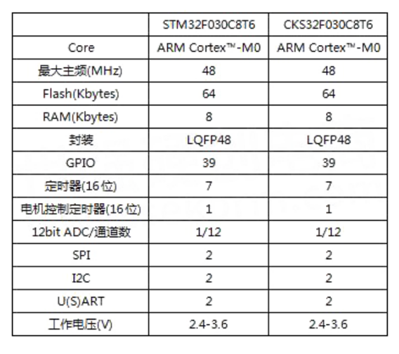 CKS32F030C8T6和ST的 STM32F030C8T6的特性对比如下表所示:
