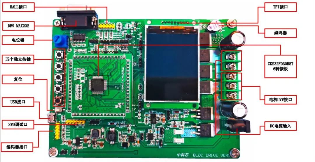 CKS32F030R8T6直流无刷电机开发板由通用底板和CKS32F030R8T6核心转接板组成,通用底板是一个BLDC调试的通用硬件平台,包含MAX232接口;支持HALL和编码器输入;含有五个独立按键,可满足常用的加速、减速、暂停、反转、急停功能操作;板载含有一个可调电位器,用于调速;板载上包含SPI TFT液晶屏接口,便于通过TFT屏输出相关参数信息;为便于一些含有USB接口的MCU调试,通用底板预留了USB接口;通用底板采用宽范围工作电压输入:18-60V,支持最大电机驱动电流为10A,用户可在此硬件平台进行方波有感、方波无感、速度开环、速度闭环等多种电机算法验证,是用户基于CKS32的BLDC快速评估的好工具。