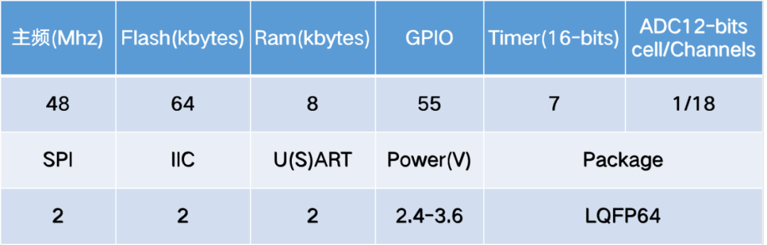 中科芯推出的CKS32F030R8T6基于ARM公司Cortex-M0内核,工作电压范围为2.4V-3.6V,最高主频48Mhz,包含64KBytes FLASH、8KBytes RAM,采用LQFP64封装,是一款高性价比的国产MCU。