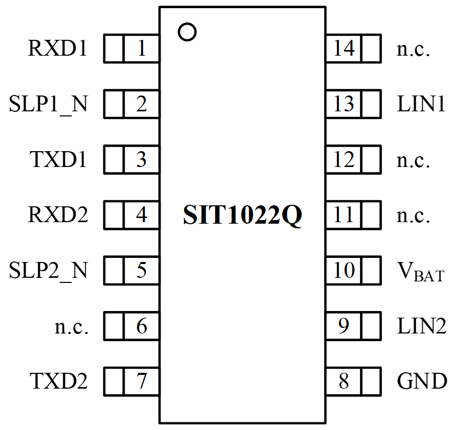 SIT1022Q是一款双通道本地互联网络(LIN)物理层收发器,符合LIN 2.0、LIN 2.1、LIN 2.2、LIN 2.2A、ISO 17987-4:2016 (12V) 和SAE J2602标准。主要适用于使用1kbps至20kbps传输速率的车载网络。SIT1022Q通过TXDx引脚控制 LINx总线的状态,可将协议控制器的发送数据流转换为具有最佳压摆率和波形整形的总线信号,以最大程度地减少电磁辐射发射(EME)。LIN总线输出引脚具有内部上拉电阻,仅当用作主机节点时,才需将LIN总线端口通过一个与二极管串联的外部电阻上拉至VBAT。SIT1022Q通过LINx引脚接收总线上的数据流,并由接收器的输出引脚RXDx将数据传送到外部的微控制器。