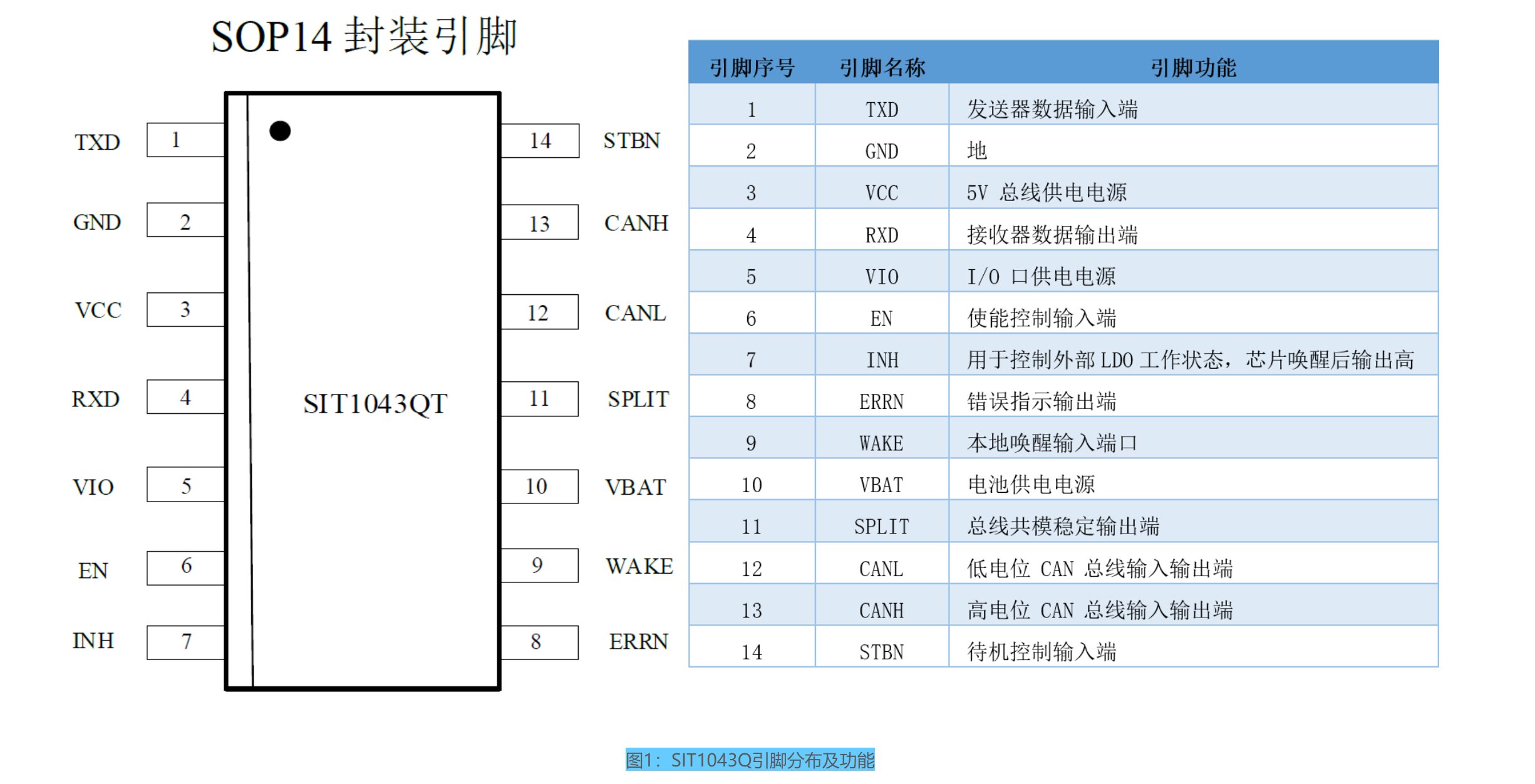 随着全球变暖,低碳发展与新能源结构转型成为全球发展趋势,在此背景之下促使新能源汽车持续释放。随着当今汽车电子系统的复杂性日益增加,对于电动新能源汽车在不增加汽车部件成本的基础上,提升电动汽车的能效及安全性提上日程。在此背景之下,芯力特电子在第一代SIT1040与第二代SIT1042CAN芯片基础之上,研发出第三代高速CAN总线收发器SIT1043Q通信芯片,用以解决车载CAN通信同时,还实现CAN网络诊断、故障安全保护、超低功耗睡眠等功能。与此同时SIT1043Q在电磁兼容(EMC)性能上有显著提高,独立HS-CAN收发器+低功耗管理+网络诊断保护 解决方案,这使汽车制造商在提升整车系统性能、产品质量和可靠性的同时,也大大降低了汽车整个网络的能耗。以下是SIT1043Q芯片引脚分布及功能: