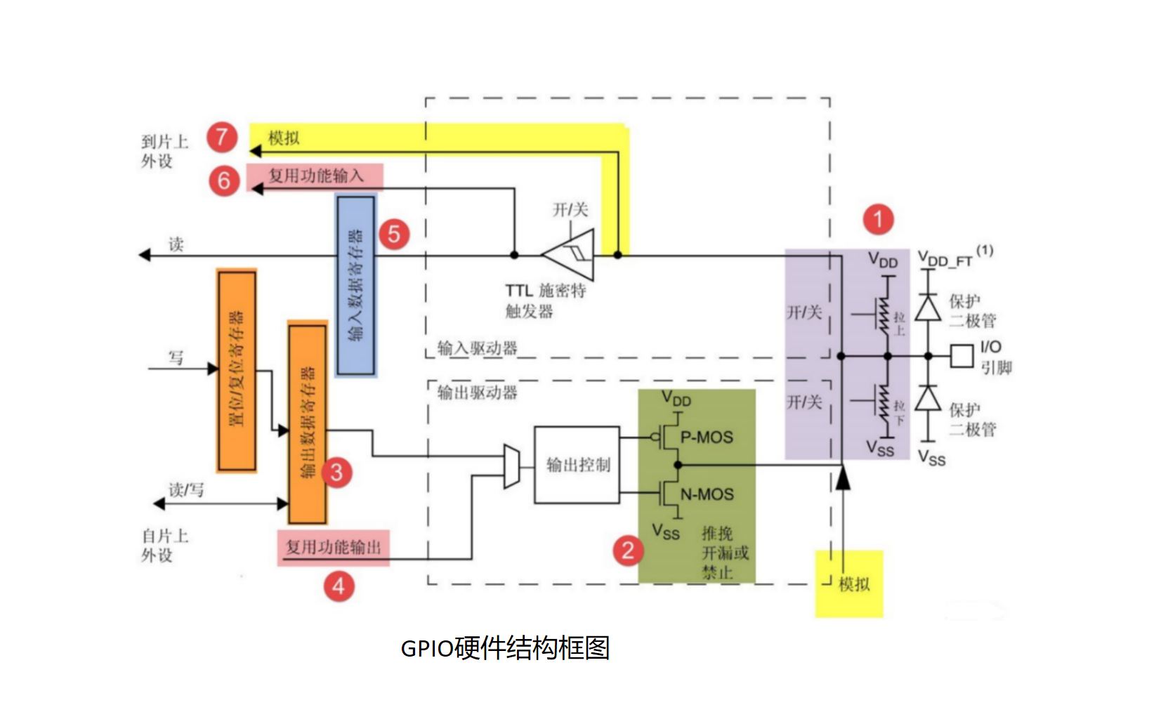 标号2处是一个由P-MOS和N-MOS管组成的单元电路。这个结构使GPIO具有了“推挽输出”和“开漏输出”两种模式。上方的P-MOS管高电平导通,低电平关闭,下方的N-MOS低电平导通,高电平关闭。