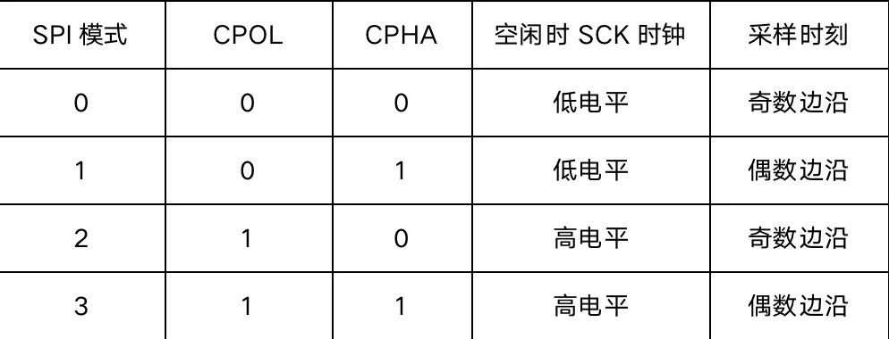 CKS32F4xx系列的SPI外设可用作通讯的主机及从机,支持最高的SCK时钟频率为fpclk/2(CKS32F407型号的芯片默认fpclk为142MHz,fpclk2为84MHz),完全支持SPI协议的4种模式。SPI协议根据CPOL及CPHA的不同状态分成的四种工作模式如下表所示: