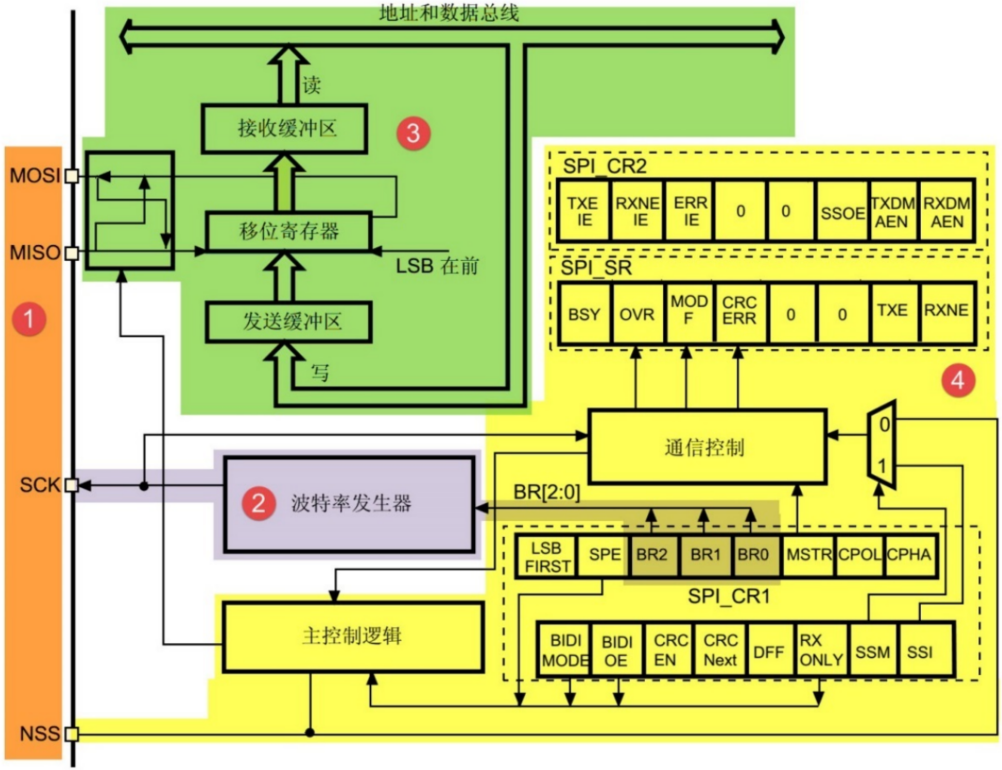 图中的3处是SPI的数据控制逻辑。SPI的MOSI及MISO都连接到数据移位寄存器上,数据移位寄存器的内容来源于接收缓冲区及发送缓冲区以及MISO、MOSI线。当向外发送数据的时候,数据移位寄存器以“发送缓冲区”为数据源,把数据一位一位地通过数据线发送出去;当从外部接收数据的时候,数据移位寄存器把数据线采样到的数据一位一位地存储到“接收缓冲区”中。通过写SPI 的“数据寄存器DR”把数据填充到发送缓冲区中,通过“数据寄存器DR”,可以获取接收缓冲区中的内容。其中数据帧的长度可以通过“控制寄存器CR1”的“DFF位”配置成8位及16位模式;配置“LSBFIRST位”可选择MSB先行还是 LSB先行。