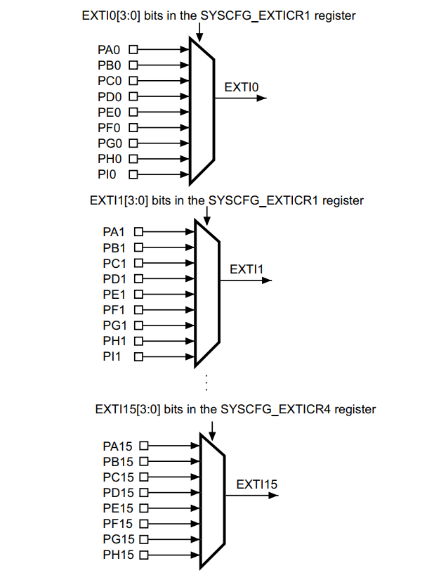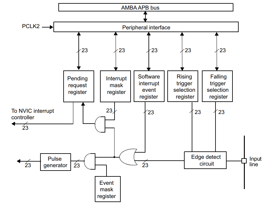 EXTI有23个中断/事件线,每个GPIO都可以被设置为输入线,占用EXTI0至EXTI15,还有另外七根用于特定的外设事件。