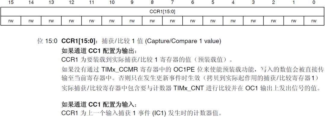 最后,我们介绍一下捕获/比较寄存器(TIMx_CCR1~4),该寄存器总共有4个,对应4 个通道CH1~4。不过TIM14只有一个,即:TIM14_CCR1,该寄存器的各位描述如下图所示: