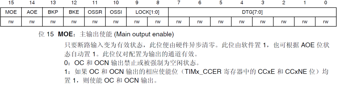 如果是通用定时器,则配置以上三个寄存器就够了,但是如果是高级定时器,则还需要配置:刹车和死区寄存器(TIMx_BDTR),该寄存器各位描述如下图所示: