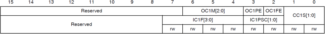 捕获/比较模式寄存器(TIMx_CCMR1/2)、捕获/比较使能寄存器(TIMx_CCER)、捕获/比较寄存器(TIMx_CCR1~4)。对于捕获/比较模式寄存器(TIMx_CCMR1/2),该寄存器一般有2个:TIMx _CCMR1和TIMx _CCMR2,不过TIM14只有一个。TIMx_CCMR1控制CH1和2,而TIMx_CCMR2控制CH3和4。以下我们将以TIM14为例进行介绍。TIM14_CCMR1寄存器各位描述如下图所示: