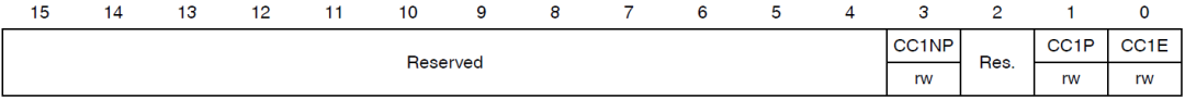 该寄存器比较简单,我们这里只用到了CC1E位,该位是输入/捕获1输出使能位,要想PWM从IO口输出,这个位必须设置为1,所以我们需要设置该位为1。因为TIM14只有1个通道,所以才只有低四位有效,如果是其他定时器,该寄存器的其他位也可能有效。